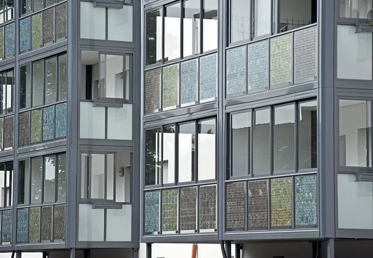 Der Balkonhersteller Balco stellt Brüstungsflächen mit integrierten Photovoltaikelementen her. Die Brüstungsverkleidung besteht dabei aus Solarzellen mit Prismenglas. Letzteres verfügt über eine kristalline Optik, die Balco neben Schwarz in verschiedenen Farben bereitstellt. Das Prismenglas wirkt sich dem Hersteller zufolge positiv auf den Stromertrag aus, da es die Sonnenstrahlen direkt auf die Solarzellen lenkt. Balco fertigt das Solarpaneel aus zwei Glasscheiben, die das Unternehmen in einem Laminiervorgang miteinander verklebt. Dazwischen befinden sich die Photovoltaikelemente. Eine spezielle Folie schützt die Zellen vor schädlicher UV-Strahlung sowie Witterungseinflüssen. Eingefasst sind die Brüstungselemente in eine vorgefertigte Grundkonstruktion aus Aluminium. Die Module speisen den gewonnenen Strom wie bei einer klassischen Photovoltaikanlage in ein städtisches Netz ein.