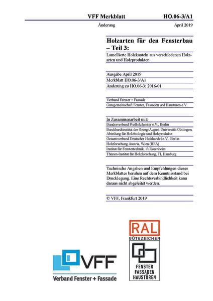 Die neue, kürzlich vom Technischen Ausschuss des Verbands Fenster + Fassade (VFF) veröffentlichte A1-Änderung im Merkblatt HO.06-3/A1: 2019-04 „Holzarten für den Fensterbau – Teil 3: Lamellierte Holzkanteln aus verschiedenen Holzarten und Holzprodukten“ ergänzt das titelgleiche Merkblatt HO.06-3: 2016-01. Es unterscheidet sich von der Vorgängerversion durch eine Erweiterung der in Anhang 3 aufgeführten Liste geprüfter und geeigneter Kombinationen von mit modifizierten Hölzern kombinierten Kantelprodukten. Die Merkblattreihe Holzarten für den Fensterbau besteht zudem aus den Teilen 1 „Eigenschaften, Holzartentabelle“, 2 „Holzarten zur Verwendung in geschützten Holzkonstruktionen“ und 4 „Modifizierte Hölzer“. Das Merkblatt HO.06-3/A1: 2019-04 erläutert im Hauptteil die für den Fensterbau geltenden Kriterien für kombinierte Kanteln aus verschiedenen Holzprodukten sowie mit Dämmstoffeinlagen. Es unterscheidet dauerhafte, an der Außenseite verwendbare Holzarten und dekorative Hölzer für Innenlamellen. Zu den geeigneten Holzarten und dekorativen Hölzern für den Innenausbau bei kombinierten Fensterkanteln gibt eine zweiseitige Tabelle Auskunft.