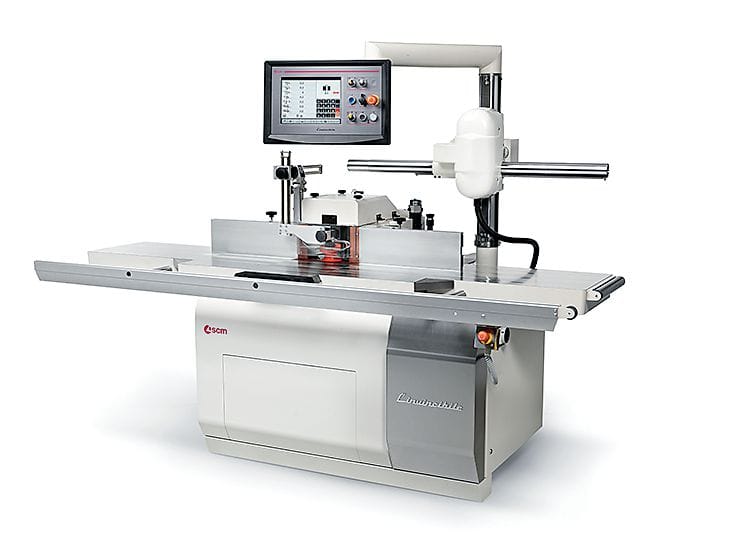 Die kompakte Bauweise der Elektrospindel ermöglichte laut SCM eine weitere Entwicklung: Die gesamte Spindeleinheit fährt auch im geschwenkten Zustand um eine zusätzliche Vertikalachse auf und ab und ermöglicht so eine deutlich einfachere Einstellung bei komplexen Profilen. Bemerkenswert sei außerdem das Werkzeugerkennungssystem. Einmal gespeichert, ruft die Maschine selbsttätig Informationen über die verfügbaren Bearbeitungsprogramme für das jeweilige Werkzeug ab – Fehlbedienungen sowie Kollisionen seien damit ausgeschlossen. Das bedeute ein hohes Maß an Sicherheit für den Bediener, aber ebenso für die Maschine einschließlich der Werkzeuge.