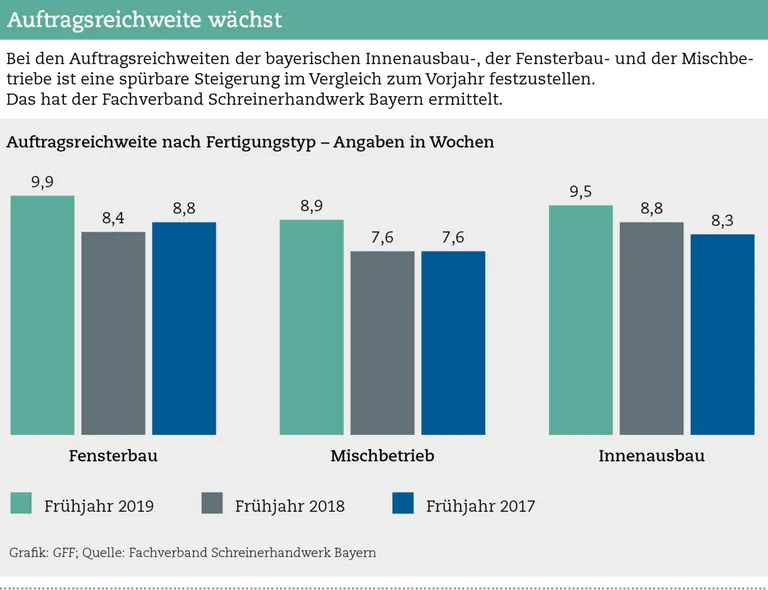 Bei den Auftragsreichweiten der Innenausbau-, der Fensterbau- und der Mischbetriebe ist eine spürbare Steigerung gegenüber dem Vorjahr festzustellen. - © Grafik: GFF; Quelle: Fachverband Schreinerhandwerk Bayern