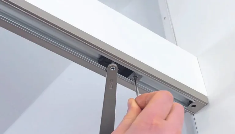 6. Schritt: Entfernen Sie die Positionierstücke und die Klebeschablone. Befestigen Sie den Hebel am Dämpfkörper. Führen Sie den Türflügel an die Gleitschiene, verschrauben Sie Gleitstein und Hebel. Öffnen Sie das Ventil geringfügig, um die Tür zu bewegen.