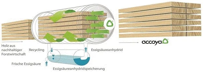 Accoya-Holz erreicht nach der Behandlung mit Essigsäure und dem Acetylierungs-Verfahren durch die Umwandlung der freien Hydroxyle in Acetylgruppen im Holz eine höhere Maßhaltigkeit als normales Holz und Dauerhaftigkeitsklasse 1, das entspricht dem Niveau von Teak. Die Modifikation verringert die Wasseraufnahme des Holzes, Enzyme können es nicht mehr verdauen – die Dauerhaftigkeit steigt. "Die Probleme mit dem Essigsäure-Geruch haben wir mittlerweile in den Griff bekommen", sagt Jörg Neben vom Außendienst bei Accoya-Lieferant Enno Roggemann. Dieser Kritikpunkt hinderte in den zurückliegenden Jahren viele Fensterbauer und Endkunden an der Nutzung von Accoya-Holz. In der Einschätzung von Rolf Menck, Geschäftsführer von Menck Fenster, zeigt sich ein etwas anderes Bild: "Die Geruchsbelästigung und feine Späne bleiben ein Problem." Dennoch seien die Verarbeitungsanforderungen durch die Kombination von Hölzern lösbar. Dabei müssten Verarbeiter die Sprödigkeit des Materials im Auge behalten.