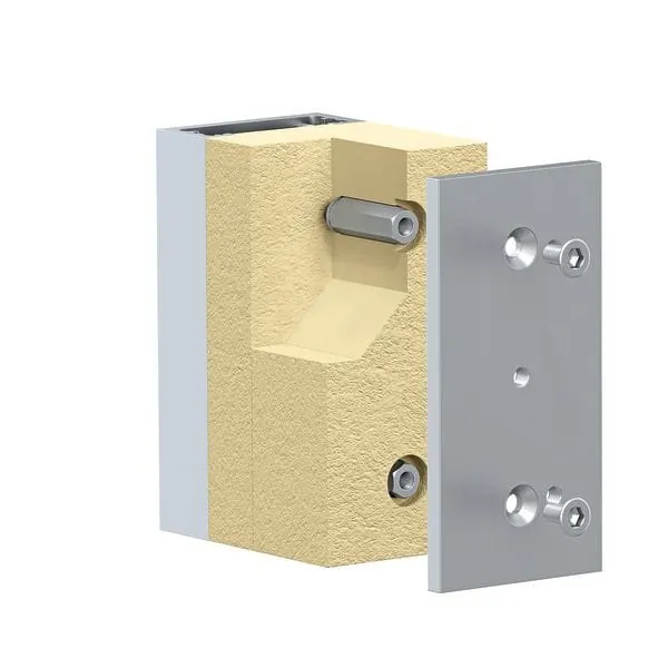 Die punktuelle Variante von Fix’n Slide besteht aus einem C-Profil zur Vormontage und zur Anbindung an die Unterkonstruktion. Fachmänner befestigen jeweils zwei variable Einschubplatten aus Edelstahl mit zugfesten Gewindestangen und Gewindemuffen sowie die druckfesten Dämmkörper. Edelstahl-Adapterplatten lassen sich optional einsetzen. Bei einer Länge von 200 Millimeter gibt es ebenfalls fünf Breiten von 48 bis zu 120 Millimeter. Die Dämmstärken betragen wie bei der Schienenausführung 50 bis 315 Millimeter.
