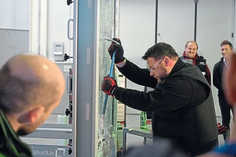 Am Firmensitz der österreichischen Leitz-Niederlassung in Riedau informierten sich Anfang Februar mehr als 50 Fensterbauer über das Verfahren und lernten an vier Praxisstationen kennen, wie das eingangs geteste RC3-Element in Bezug auf die Verklebung gefertigt wird.