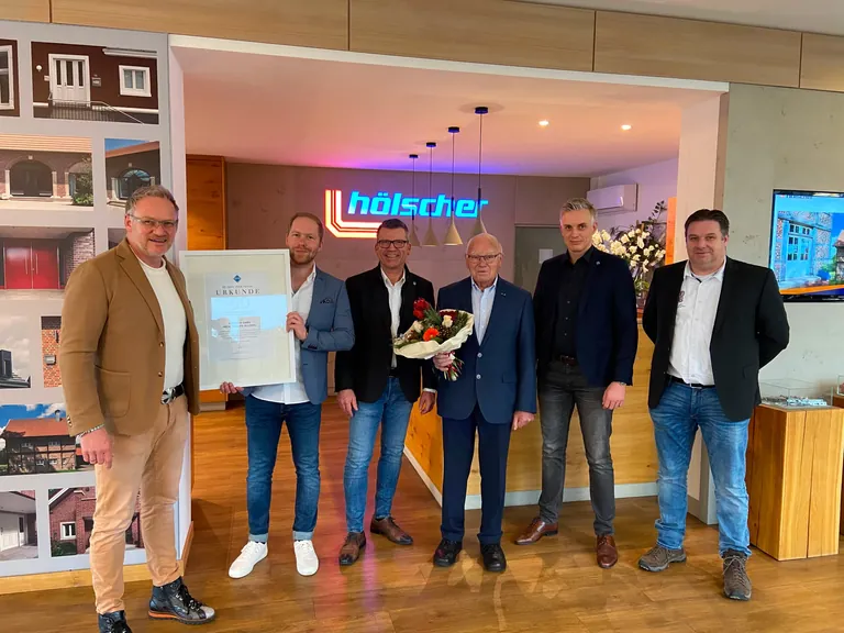 Zum Dank für die 50-jährige partnerschaftliche Zusammenarbeit überreichte Veka der Firma Hölscher eine Erinnerungsurkunde (v.li.): Norbert Hölscher, Christian Meinert (Abteilungsleiter Kunststofffenster Hölscher), Matthias Venns (Veka), Wilhelm Hölscher, Alexander Scholle (Veka) und Frank Hölscher. - © Veka