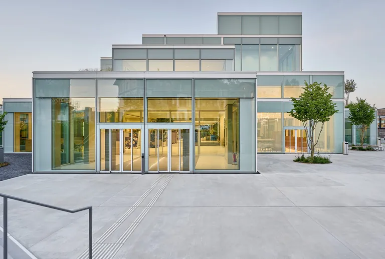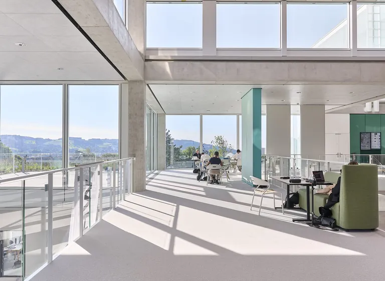 Auf dem Campus der Universität St. Gallen ist ein terrassierter Bau entstanden, der sich elegant in die umgebende Topografie eingliedert. Eine Doppelhautfassade mit Glaslösungen erzeugt Transparenz und sorgt für thermische Behaglichkeit.
