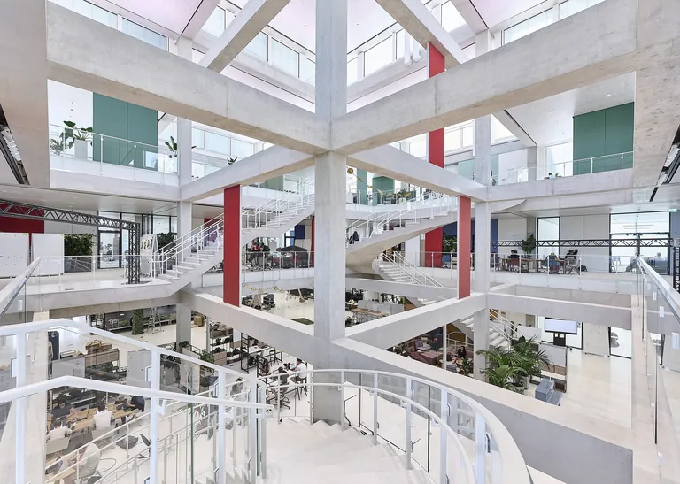 Die akustische und visuelle Verschränkung der Module erzeugt bei Eintritt in das Gebäude eine große Halle, die als eine Art Marktplatz für den Ideenaustausch gedacht ist. In den oberen Etagen befinden sich flexibel nutzbare Räume für Gruppenarbeit.