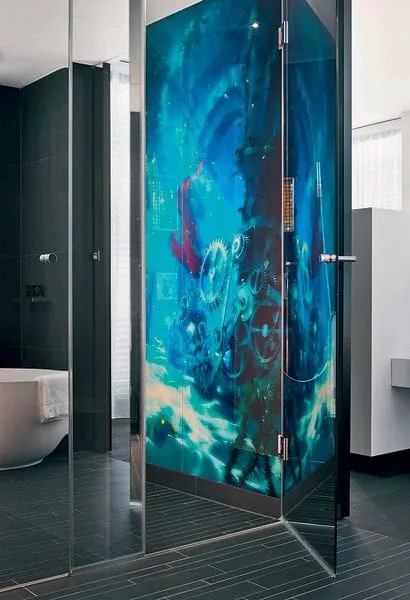 Mit seiner Präzision eigne sich das digitale Direktdruckverfahren Colorprint HD von Glas Trösch für die Schaffung von Traumwelten. Das Glas als gestalterisches Element stellt in gestochen scharfer Bildqualität und brillanten Farben fünf Unterwasserszenarien dar, in denen sich Schatztruhen, Uhrwerke und überdimensionale Schokoladentafeln finden. Hinter acht Millimeter ESG gedruckt und anschließend an der Wand verklebt, sind die Gläser das offensichtliche Highlight der ansonsten eher reduzierten Badgestaltung.