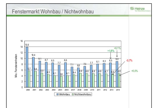 Nach Zahlen von Heinze legt der Fenstergesamtmarkt von 13,1 Millionen verkauften Fenstereinheiten (FE) 2013 (+ 0,9 Prozent zu 2012) im kommenden Jahr deutlich auf 13,9 Millionen FE (+ 5,7 Prozent). Besonders gut werde sich laut den Marktforschern der Neubau entwickeln: von fünf Millionen FE 2013 (+ 2,4 Prozent) steigt der Absatz in diesem Sektor 2014 auf 5,4 Millionen FE (+ 8,4 Prozent). Der Sanierungsmarkt dominiert weiterhin (2013: 8,1 Millionen FE; 2014: 8,5 Millionen FE), steigt aber mit langsamerem Tempo: 2013: + 0,1 Prozent; 2014: + 4,1 Prozent.
