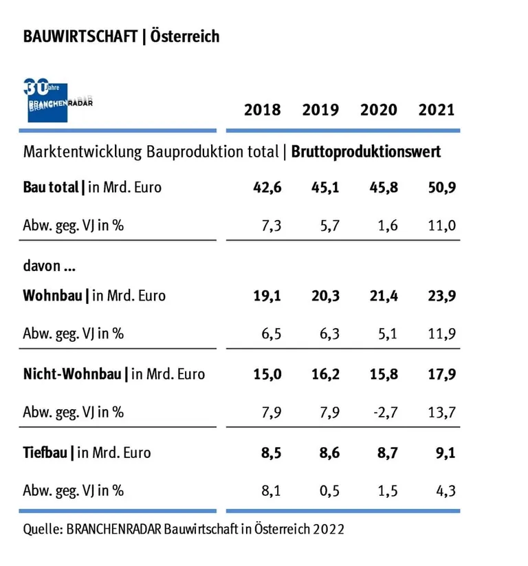 Nachdem die Bauwirtschaft bereits das Krisenjahr 2020 vergleichsweise gut überstand, startete man im vergangenen Jahr eindrucksvoll durch. Laut aktuellem Brachenradar Bauwirtschaft in Österreich erhöhte sich im Jahr 2021 der Bauproduktionswert für die gesamte Bauwirtschaft um elf Prozent gegenüber dem Vorjahr auf zirka 50,9 Milliarden Euro. Damit wurden beinahe 5,1 Milliarden Euro mehr investiert als im Jahr davor. Im Jahresabstand wuchs die Bauproduktion im Wohnbau um 11,9 Prozent auf 23,9 Milliarden Euro, im Nicht-Wohnbau um 13,7 Prozent auf 17,9 Milliarden Euro und im Tiefbau um 4,3 Prozent auf 9,1 Milliarden Euro.