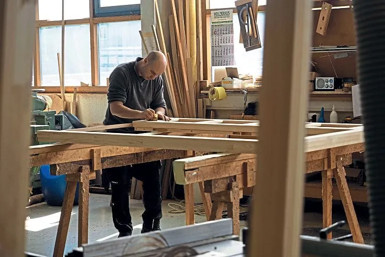 Gegründet wurde Schenk Fenster und Türen im Jahr 1945 als Bautischlerei. Nachdem Herbert Schenk das Unternehmen im Jahr 1978 übernommen hatte, forcierte er zunächst das Geschäft mit Holzfenstern. 1992 nahm er marktbedingt die Fertigung von PVC-Fenstern auf, 1999 kam die Produktion von Aluminium-Elementen dazu. In der Holzfertigung entstehen heute 30 bis 35 Fenstereinheiten täglich, die Qualität der Elemente habe dabei höchste Priorität. „Wir legen extrem viel Wert auf eine schöne Oberfläche. Wir haben erst jüngst einen Neukunden gewonnen, der aufgrund der Oberflächenqualität zu uns gewechselt ist“, sagt Jerome Krieck im Gespräch mit GFF. Sehr gut ausgebildete Mitarbeiter, insbesondere in der Arbeitsvorbereitung, legten die Grundlage für dieses Produkterlebnis. Das Holz-Segment trägt zirka drei Millionen Euro zum Gesamtumsatz von zehn Millionen Euro bei; der PVC-Bereich liegt bei fünf Millionen Euro. Viel mehr wachsen soll das Unternehmen gar nicht. „Wir wollen den Umsatz halten, aber an den Kosten drehen“, nennt Krieck als die ökonomische Zielsetzung.