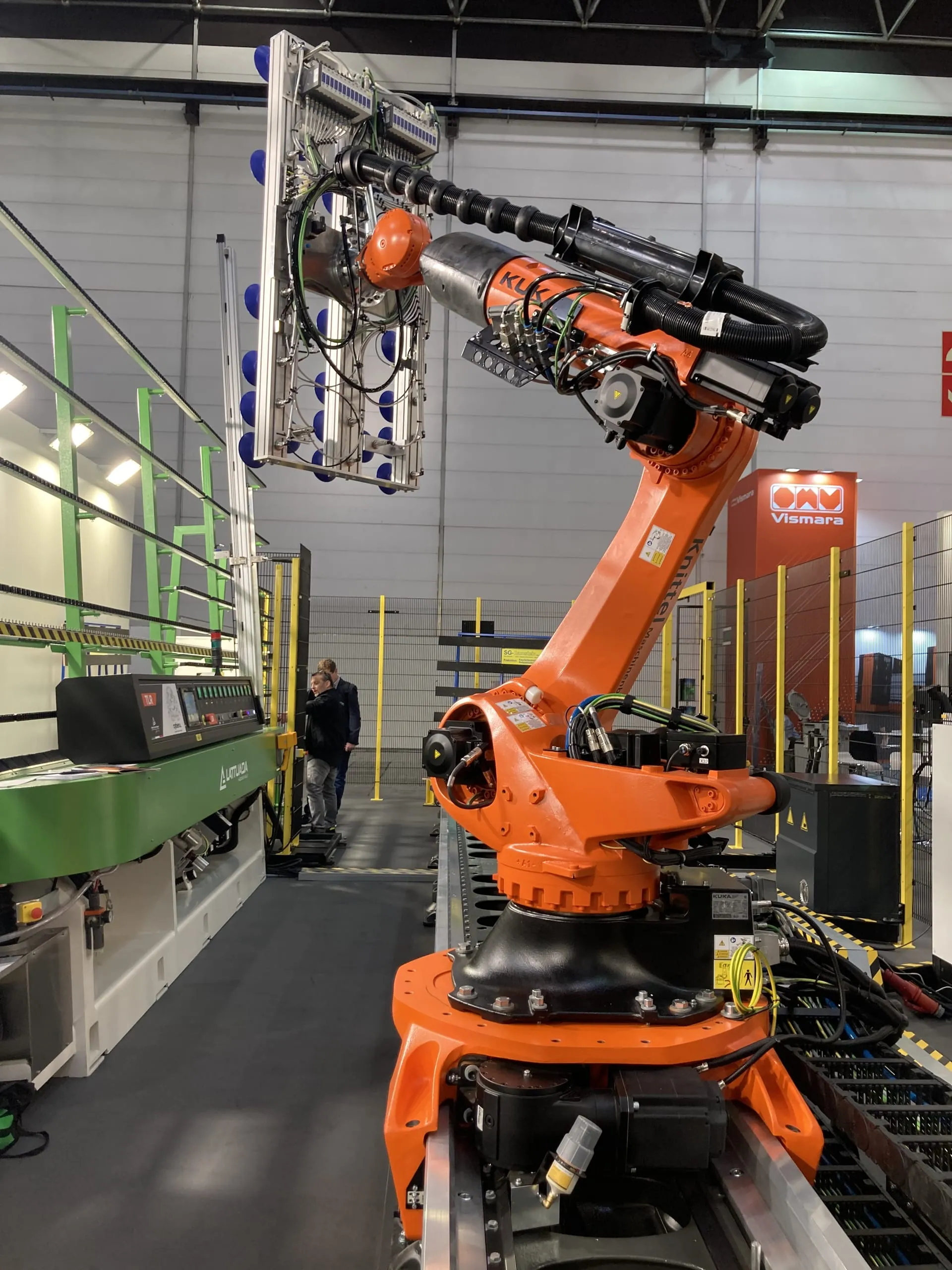 Maschinenbauer Lattuada zeigt in Halle 16, Stand A60, eine Schleifmaschine, die das Unternehmen in Kooperation mit Knittel Glas aus Bielefeld konzipiert hat. Das deutsche Unternehmen hat das Automatisierungskonzept entwickelt, das komplett auf Roboterbetrieb basiert. - © Dirks