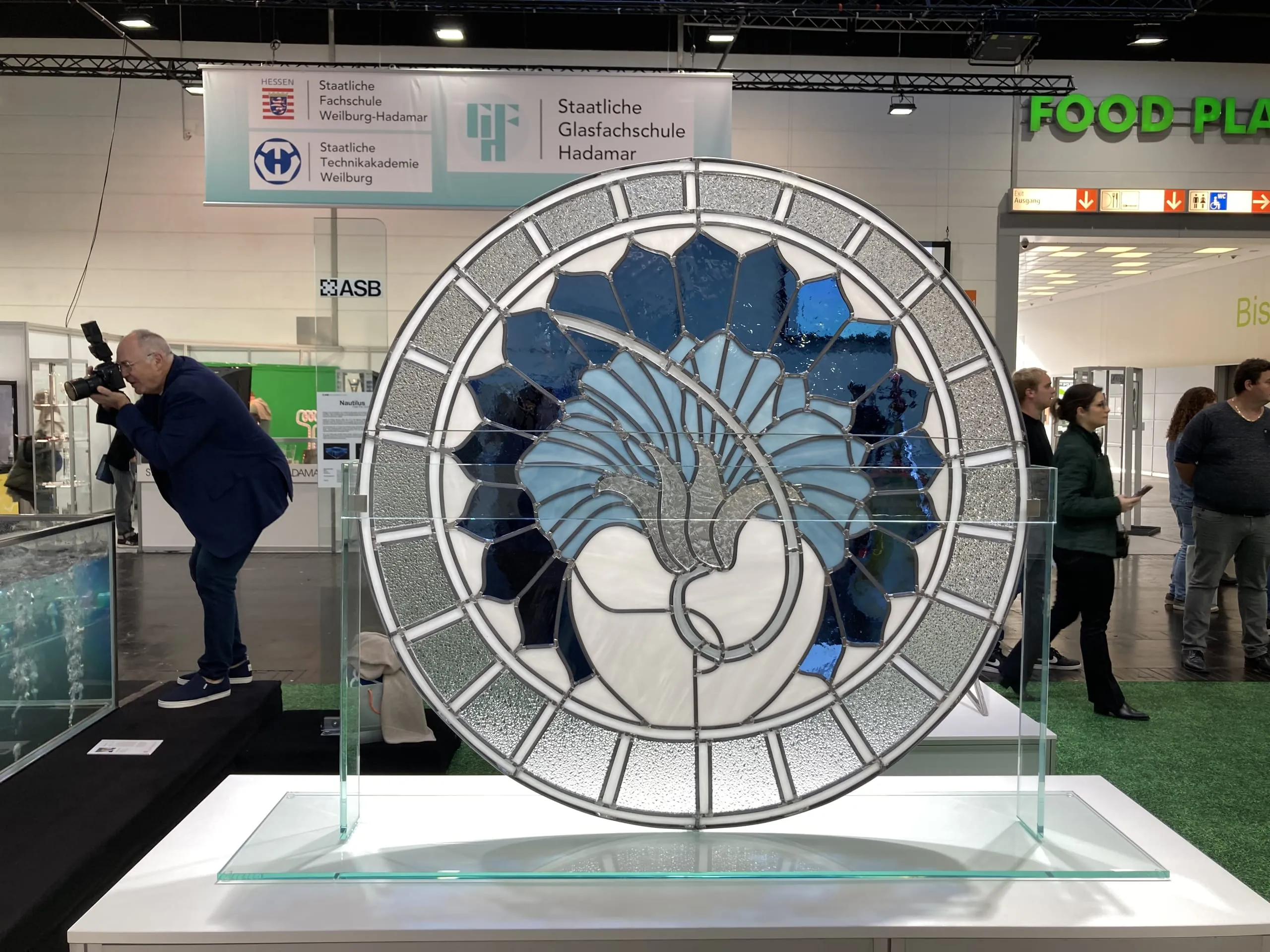 Ebenfalls ein Beitrag im Wettbewerb Glass Art Competition: Eisblume von Benjamin Bak, veredelt mittels Eisblumierung und Sandstrahlen. Das Motiv wurde mit bläulichen, weißen und grauen Gläsern ausgearbeitet. Ausgestellt in Halle 10. - © Dirks
