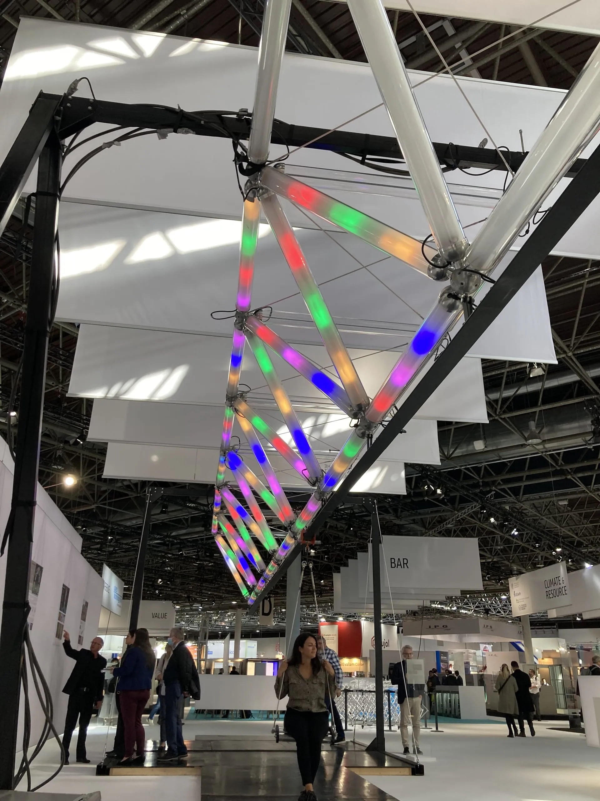 In Halle 11, Stand C24, ist die Sonderschau Glass Technology Live (GTL) zu sehen. Konzipiert wird die GTL von den Technischen Universtäten in Darmstadt, Delft, Dortmund und Dresden. Im Bild Ziptruss, eine schwingende Konstruktion der TU Delft, die für Vorlesungen in Statik und Mechanik eingesetzt wird. - © Dirks