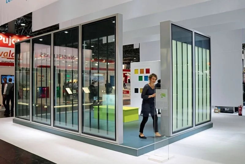 Als eines der ersten kommerziellen Projekte hat das Technologieunternehmen Merck die Fassade eines Erweiterungsbaus für den Leipziger Maschinenbauer Kirow mit seiner neuen Liquid Crystal Window-Technologie (LCW) ausgestattet. Die selbstverschattende Flüssigkristallverglasung entwickelt einen neutralen Grauton, der sich automatisch oder per Knopfdruck von hochtransparent zu einem sehr dunklen Grau schalten lässt. Auf der gtl präsentierte Merck einen 1:1-Teilnachbau des Originalbauwerks, das in Kürze fertiggestellt wird. Der Demonstrator bestand aus 50 verschiedenen Dreiecksgläsern, mit Abmessungen von ca. 1,4 mal 1,4 Meter, getragen durch eine Stahlkonstruktion. Alle Flüssigkristallgläser waren einzeln schaltbar und stellen, von speziellen Steuergeräten betrieben, das Potenzial der Technologie dar.