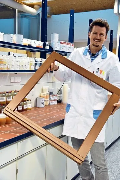 „Fenster- und Schiebetürelemente werden immer größer und dadurch schwerer“, sagt Dr. Simon Leimgruber, der Leiter der Adler-Entwicklungsabteilung für Fensterbeschichtungen. Fast zwangsläufig müssten Nutzer deshalb beim Öffnen oder Schließen den Rahmen angreifen. Dabei setzt das natürliche Hautfett dem Holz zu, auch kommt es schnell zu Kratzern. Große Elemente seien zudem anfälliger für Oberflächenschäden infolge des Transports und der Montage. An der Außenseite wiederum leiden Holzfenster unter den zunehmend extremen Witterungsschwankungen. Große Hitze, UV-Strahlung, Kälte, Regenschauer und Hagelstürme stellen eine enorme Belastung dar. Um diesen Herausforderungen Herr zu werden, setzt Adler auf eine Technologie, die sich bereits vielfach bewährt habe, im Fensterlack-Bereich aber Neuland darstelle: nämlich auf ein zweikomponentiges wasserbasiertes Beschichtungssystem, das durch die Zugabe eines Härters hohe Widerstandsfähigkeit erreiche.