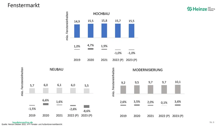 Die Prognosen berücksichtigt, aufbauend auf dem bisherigen Erhebungsmodell, die derzeitigen Auswirkungen des Ukrainekriegs mit Lieferengpässen und gestiegenen Beschaffungskosten ebenso wie die geänderten Rahmenbedingungen des Markts infolge Energiekosten, Inflation und Zinsentwicklung. Sowohl im Fenster- als auch im Außentürenmarkt wird es bei relativ stabilen Marktlagen 2023 allerdings deutliche Verschiebungen der Marktanteile vom Neubau zur Sanierung geben.