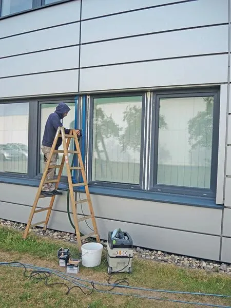 Trotz guter Auftragslage war Freiberg sich bewusst, dass die große Sanierungswelle im Bereich Alu irgendwann auslaufen wird. So suchte er nach einem weiteren Standbein – und fand dieses im Bereich Fenster und Türen. „Dort passiert mehr als woanders. Das ist einfach so“, erläutert der Oberflächenspezialist seine Entscheidung. Im Jahr 2011 kam er durch einen Zufall in Kontakt mit der Firma Renolit, die gerade ihren Service zur Reparatur folierter PVC-Profile aufbaute. „Wir waren einer der ersten Betriebe, der von Renolit geschult wurde und als externes Unternehmen Foliensanierungen ausführte“, berichtet Freiberg. In der Folge wurden u.a. Fensterhersteller wie Weru auf den kleinen Betrieb in Baden-Württemberg aufmerksam. Seit 2014 übernimmt Freiberg zudem den Werkskundendienst für die Systemgeber Veka und Aluplast. Das Geschäft mit der Foliensanierung hat sich nach seinen Angaben relativ gut entwickelt – mittlerweile arbeitet er u.a. auch mit Hornschuch zusammen. „Im bisherigen Topjahr haben wir zirka 5.000 Laufmeter PVC-Profile neu foliert“, sagt der Fachmann. Die Foliensanierung bietet der Betrieb zum Festpreis pro Laufmeter Profil an, ebenso wie die Anreise innerhalb Deutschlands. Neben folierten PVC-Fenstern kümmert sich Freiberg auch um Schäden an weißen PVC-Fenstern. Die Geschäftsfelder des Betriebs sind damit noch nicht erschöpft: Freiberg ändert ferner das Corporate Design von Immobilien, indem er Alu-Elemente mit Folien aus dem Kfz-Bereich beklebt. Folierte PVC-Fenster lassen sich nach seinen Angaben ebenfalls umgestalten. Des Weiteren befreit der Experte Gläser von Verkalkungen und von fest anhaftenden Verschmutzungen.
