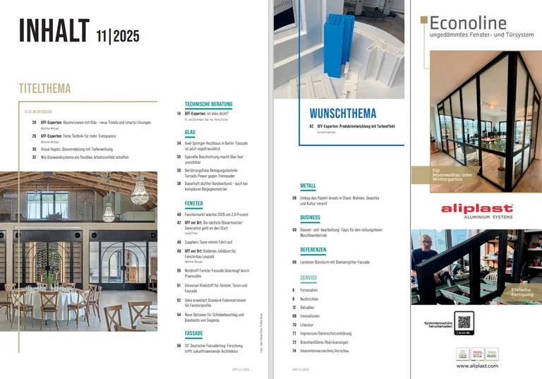 Die GFF-Ausgabe 11/25 zeigt im Titelthema, wie Glas Innenräume verwandelt. Weitere Themen sind die Schlagregendichtheit von Fensteranschlüssen, sehenswerte Meisterstücke aus Karlsruhe sowie Tools für eine beschleunigte Produktentwicklung.