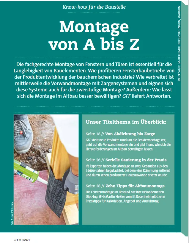 Am 6. Februar erscheint unsere nächste Ausgabe. Darin berichten wir u.a., welches Know-how und welche Produkte nötig sind für eine sachgerechte Montage von Fenstern und Türen. Im Fokus stehen Bauchemie, Befestigungen sowie Zargen. Außerdem haben wir erstmals einen Marktreport über Profile erstellt. Mehr dazu hier.