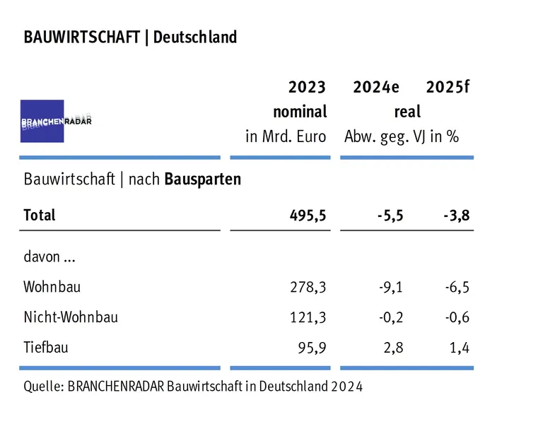"Ohne staatliche Wachstumsimpulse wird die Bauproduktion real auch im kommenden Jahr schrumpfen", ist sich Kreutzer sicher, "zumal die Baubeginne konstant erodieren. Aus heutiger Sicht erwarten wir für 2025 einen Rückgang um 3,8 Prozent. Das träfe dann nochmals rund 115.000 Beschäftigte.
