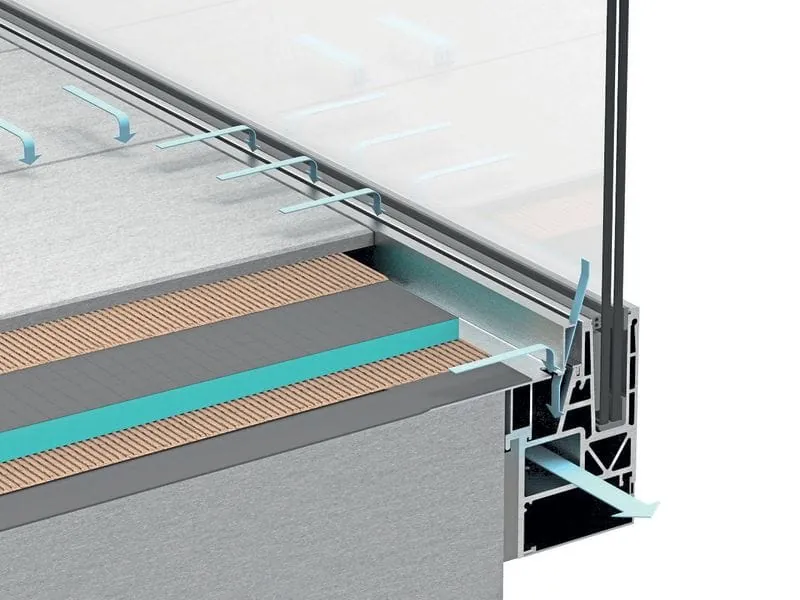 Das Geländersystem Aqua Viva nimmt das Oberflächenwasser über die schmale Einlaufrinne oder das Sickerwasser über eine Balkonabdichtung auf und führt die Feuchtigkeit durch einen unsichtbaren Ablaufkanal in die Fallrohre ab.