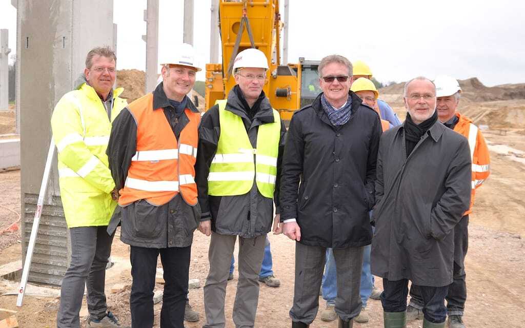 Gemeinsam ließen die Verantwortlichen des Bauprojektes die zirka 30 Tonnen schwere Betonstütze mit dem Baukran in das vorbereitete Fundament. „Das sogenannte Stützenfest ist auf einer Baustelle unserer Größenordnung ein echtes Highlight“, erklärt Alfons Konersmann, Projektleiter für den Solarlux-Campus die Veranstaltung. „Diesen wichtigen Schritt muss man feiern, wie die Grundsteinlegung beim Hausbau.“ Nach Fertigstellung ist das Hochregallager 25 Meter breit, 90 Meter lang und etwa 20 Meter hoch.