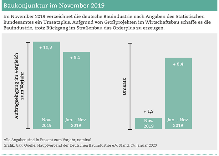 Im November 2019 verzeichnet die deutsche Bauindustrie ein Umsatzplus. Auch der Auftragseingang sei im Vergleich mit dem Vorjahr angestiegen. Das meldet das Statistische Bundesamt.