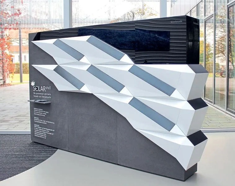 So sei es schließlich gelungen, mit der gleichen Modulfäche 50 Prozent mehr Energie einzufahren als mit vertikal an der Hauswand installierten Solarelementen. Mithilfe dieses Verfahrens lasse sich für jeden beliebigen Standort die bestmögliche Süd-, West- oder Ostfassade entwickeln. Anhand ihrer Entwürfe realisierten die Architekten vor zirka zweieinhalb Jahren einen zwei mal drei Meter großen Demonstrator aus Alu-Verbundplatten mit neun eingelassenen Solarmodulen.