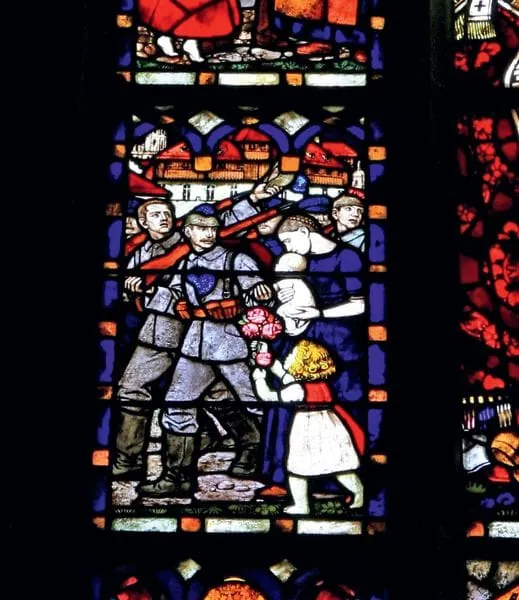 Dieses Kirchenfenster illustriert in acht Szenen das schreckliche Gesicht des Krieges: Familien nehmen (teils für immer) Abschied, Soldaten ziehen auf das Schlachtfeld hinaus.