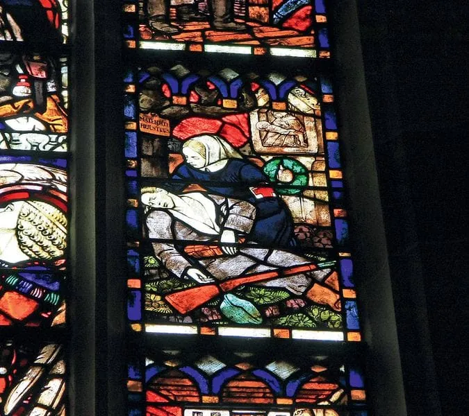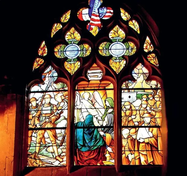 In Semur-en-Auxois zeigt diese Glasmalerei auf einem Kirchenfenster amerikanische Soldaten im Gefecht und als Verwundete im Lazarett.