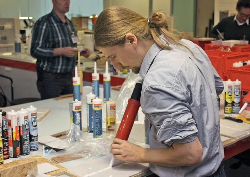 Für die Fachpressereise hatte sich Alexander von Vulté, Marketingleiter von Soudal Deutschland, diese Praxisstunde ausgedacht. Die Journalisten testeten den Einsatz von Acryl, Silikon und Hybrid-Polymer als Dichtstoff und Klebstoff mit verschiedenen Materialien. Dabei fiel die gute Verarbeitbarkeit der Hybride auf, die schnell trockneten und gut an feuchten Untergründen hafteten. Ein transparentes Hybrid-Polymer für Verklebungen sowie die Abdichtung an fast allen Oberflächen, z.B. auf Glas, hat Soudal mit Fix All High Tack Clear im Angebot.