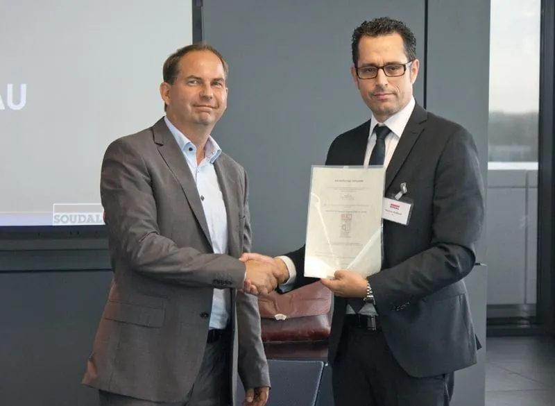 In dem auf die verschiedenen Anforderungen der Abdichtung von Baukörperanschlussfugen abgestimmten Soudal-Window-System (SWS) hat Soudal Acryle, PU-Schaum, Silikone und Hybrid-Polymere zusammengestellt und geprüft. Mit dieser Lösung haben Verarbeiter nach Herstellerangaben die Sicherheit, dass die Abdichtung innen, in der Mitte und außen zueinanderpasst und den Anforderungen der RAL-Montagevorgaben entspricht. Beim Pressetermin übergab RAL-Geschäftsführer Thomas Roßbach das RAL-Gütezeichen Fugendichtungs-Komponenten und -Systeme für das SWS-System zur Abdichtung von Fensterfugen im Baukörperanschluss an Harald Lüdtke, Geschäftsführer Soudal Deutschland. „Dieses Zertifikat spielt eine entscheidende Rolle für die Positionierung unserer Produkte am Markt. Der Verarbeiter bekommt ein geprüftes System aus einer Hand für hohe Sicherheit in der Anwendung“, sagte Lüdtke. So habe der Fachbetrieb eine Lösung für jede Einbausituation, ohne sich ein System aus diversen Produkten aufwändig selbst zusammenzustellen. „Die RAL-Anforderungen liegen über den Standards der einschlägigen Normen und bieten zusätzliche Sicherheit“, sagt der Deutschland-Geschäftsführer. Die Gütegemeinschaft hat alle Bestandteile des Systems zertifiziert, dessen Produkte im Aufbau je nach Montagebedingungen variieren. Einen Praxistest zum SWS lesen Sie in der GFF-Ausgabe 1/2017 zur Messe Bau 2017 in München.