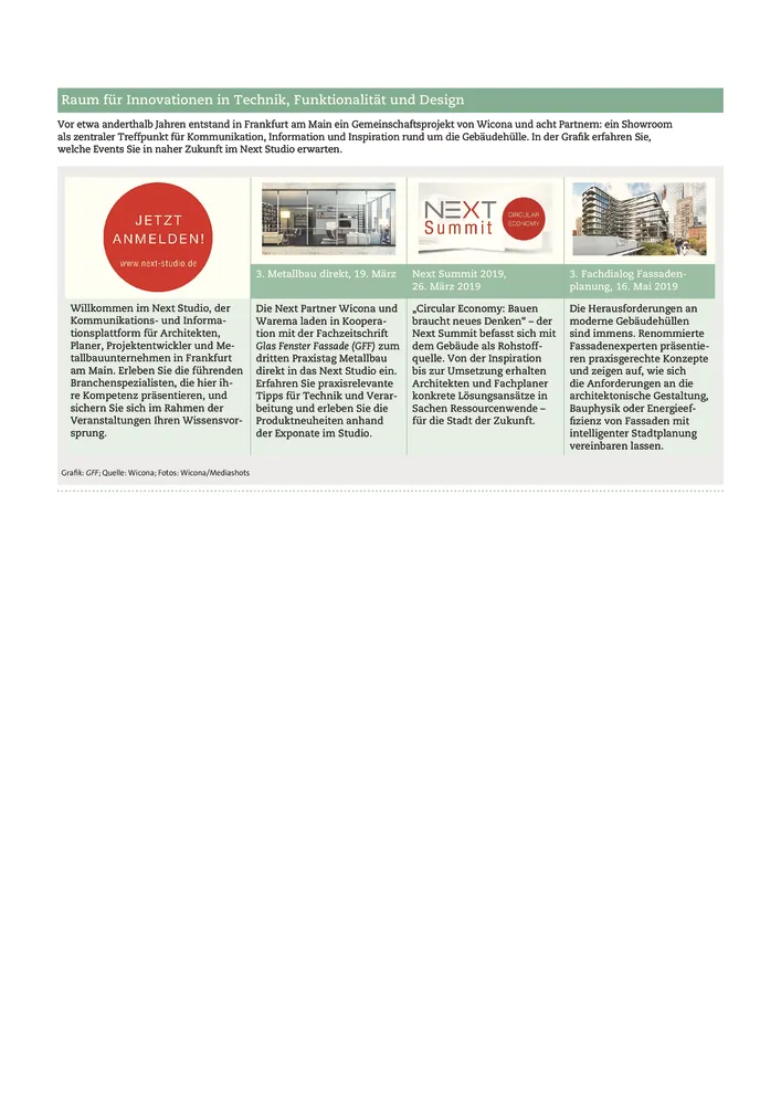 Der Praxistag Metallbau direkt im Next Studio in Frankfurt erlebt die dritte Auflage: Am 19.März 2019 präsentieren Wicona, Warema und GFF den Profis aus Metall- und Fassadenbauein Programm mit zukunftsweisenden Lösungen und hohem Maß an Praxisbezug.