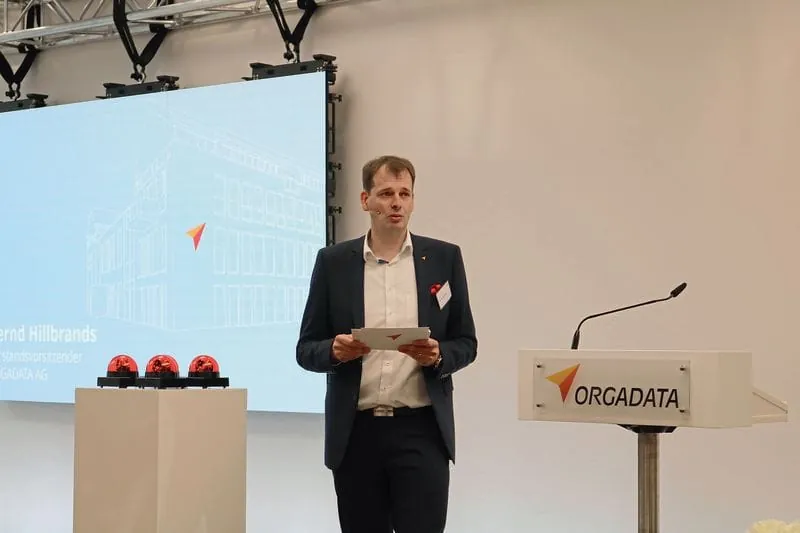 Durch den rasanten personellen Anstieg platzte das Firmengebäude in Leer schnell aus allen Nähten, man mietete Büros in umliegenden Immobilien an, wobei jede Abteilung ihr eigenes Süppchen kochte.Aber das war nicht das, was der DNA von Orgadata entsprach. „Gute Kommunikation ist das A und O“, sagte Firmenchef Hillbrands bei der Feier am 3. Mai 2019 in Leer. „Deshalb wollten wir offene Räume für kreative Köpfe schaffen.“ Vor zirka vier Jahren fiel dann die Entscheidung, am Hauptsitz einen Neubau zu errichten, der genügend Kapazitäten für alle bietet.