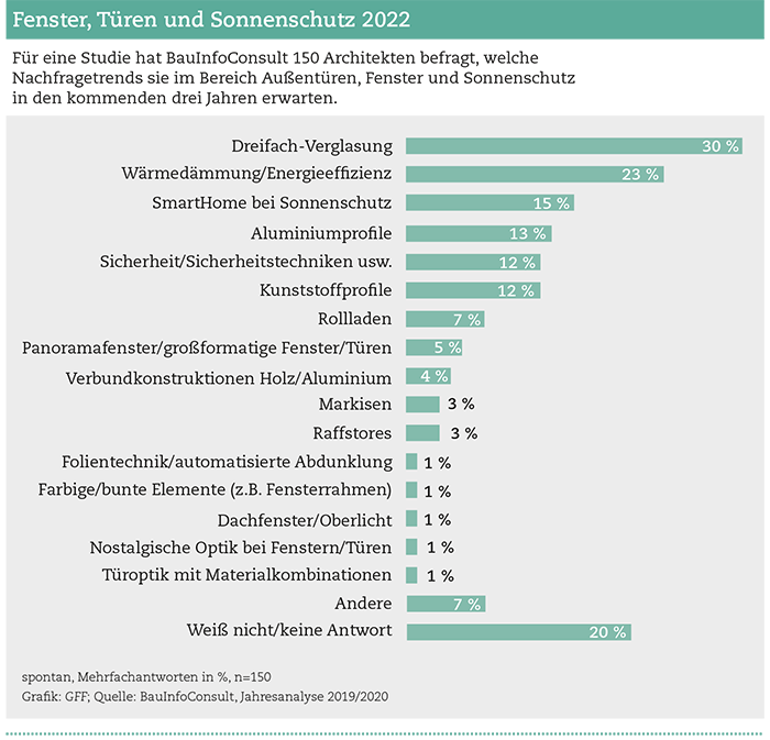 Die Düsseldorfer Marktforscher von BauInfoConsult haben 150 Architekten telefonisch dazu befragt, welche Nachfragetrends sie in den kommenden drei Jahren für die Bereiche Außentüren, Fenster sowie Sonnenschutz erwarten. Hier prognostizieren die Planer einen starken Nachfragetrend in Richtung der Energieeffizienz (23 Prozent). Damit bestätigen die Architekten nochmals die aktuelle Trendeinschätzung, dass der Themenkomplex Energieeinsparung bzw. Energieeffizienz bereits heute schon einer der bestimmenden Trends ist – wie weitere Ergebnisse der jährlich erscheinenden Branchenstudie Jahresanalyse zeigen.