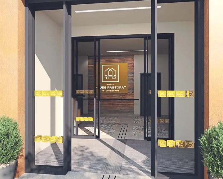 Empfehlenswert sind entspiegelte Gläser. Entspiegelte Glasflächen bieten von Weitem eine bessere Orientierung und zugleich Sicherheit. Nutzer mit eingeschränkter Sicht profitieren von weiterer Unterstützung: Das Beispiel des Hotels Neues Pastorat in Heiligenhaus (siehe Bilder) zeigt, wie das Leitsystem blinde und seheingeschränkte Gäste sicher führt – von außen durch den Windfang mit Sauberlaufmatte und integrierten Leitstreifen hindurch über taktile Bodenindikatoren (TBI) bis hin zur Rezeption.