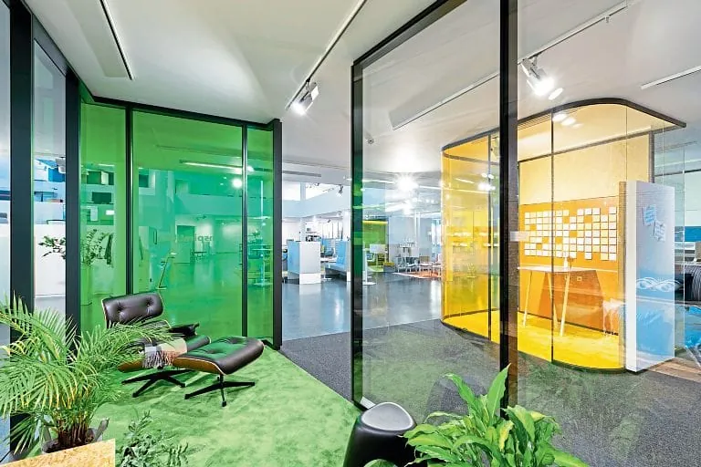 Ein Beispiel für einen Inspirationsraum liefert Feco: An einem mit grünem Glas gestalteten Ort tanken Teammitglieder neue Energie. Für die Schallschirmung sorgt nach Unternehmensangaben die bodengeführte Feco-Glasschiebetür ST10B mit seitlichen Dichtlippen und einem Schalldämmprüfwert bis Rw,P = 27 Dezibel. Der Wissenstransfer findet im Raum für die Kommunikation in der Nähe der Teamarbeitsplätze statt. Ideen skizzieren die Nutzer unmittelbar an die Whiteboardoberflächen der Wände. Die rahmenlose, flächenbündige Doppelverglasung ist auf einem umlaufend 20 Millimeter schlanken Tragrahmen mit Lärche-Holzoberfläche im Structural Glazing-Verfahren verklebt.