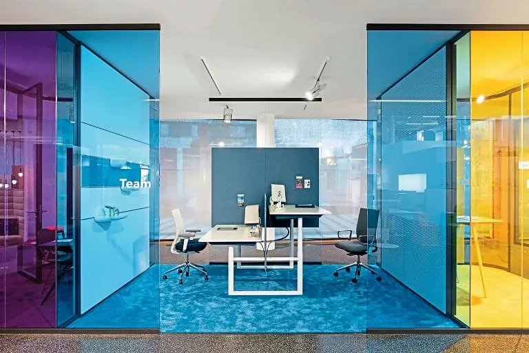 Dicht daran angebunden ist ein Ort für konzentriertes Arbeiten, der als gläserner Think Tank mit gebogenen, roséfarbenen Fecoplan-Glaswänden Rückzugsmöglichkeit bietet. Das Structural Glazing-Türelement ist beidseitig zargenbündig und sorgt laut Feco mit einem Schalldämmprüfwert von 37 Dezibel für die nötige Ruhe. Der Besprechungsraum mit der rahmenlosen, flächenbündigen SG-Verglasung des Typs Fecostruct und der wandbündigen Doppelverglasung Fecofix mit umlaufend 20 Millimeter schlankem Aluminiumrahmen ermöglicht den intensiven Informationsaustausch. Die flurseitige Glaswand ist mit rotem Glas ausgeführt. Damit liefert Feco eine Lösung, um die Räume für Ideen und Projekte in der agilen Arbeitslandschaft der Zukunft zu gestalten.