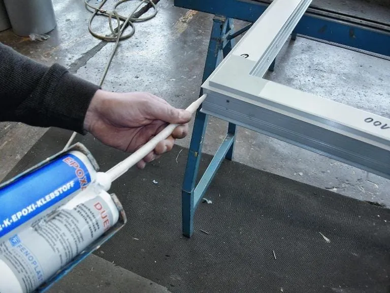 4. Schritt: Bei einem vorgelochten System den Klebstoff einspritzen, bis er aus der zweiten Bohrung wieder austritt; alternativ: Bringen Sie bei konventionellen Eckwinkeln den Klebstoff in die zu verbindenden Teile ein und fügen Sie diese anschließend zusammen.