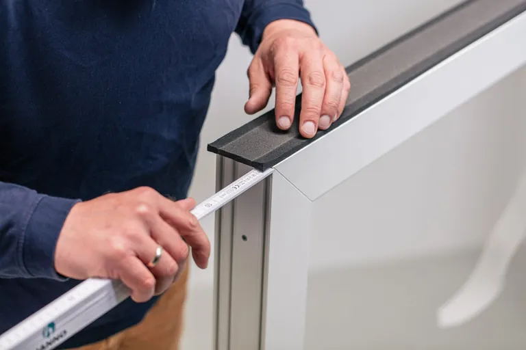 2. Schritt – Band anbringen: Verarbeiten Sie das Fugendichtband zügig. Umgebungs- und Materialtemperatur sowie das Alter des Multifunktionsbands wirken sich auf das Aufgehverhalten aus – je kühler die Temperatur ist, desto langsamer erfolgt die Ausbreitung. Kleben Sie das selbstklebende Band mit der gemessenen Fugenbreite auf den Rahmen und drücken Sie es an. An den Ecken lassen Sie das Band um die gemessene Fugenbreite überstehen.