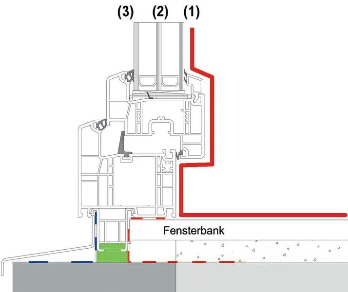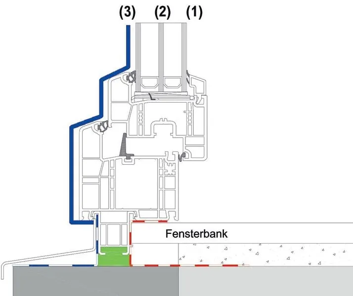 Fenster und Türen sind konstruktiv delikate Schnittstellen innerhalb der Fassade. Luftdichte, Taupunkt und Kondensatniederschlag mit einhergehenden Schimmelschäden sind die meistdiskutierten Themen. In der Tat: Fenster und Türen sind hochkomplizierte Mehrkämpfer. Sie sollen nahezu unsichtbar sein, dem Regen und Wind trotzen, Schallschutz leisten, Temperaturdifferenzen zuverlässig abpuffern und Energie einsparen. Zugleich müssen sie Gebäudebewegungen formstabil abfangen; und der Nutzer muss sie leichtgängig mit einer Hand öffnen können. Damit dies alles funktioniert, muss neben dem Bauteil selbst sowie dessen stabiler Befestigung vor allen Dingen die Abdichtung fachgerecht ausgeführt sein. Mit dem Ebenenmodell sollte hier nichts mehr schieflaufen. Jede Fassade setzt sich aus drei Funktionsebenen zusammen. Dabei übernimmt jede eine spezielle Funktion. Von innen nach außen gesehen: das Trennen von Raum- und Außenklima, den Wärme- und Schallschutz sowie den Wetterschutz. Wenn der Fenstermonteur diese drei Funktionsebenen nicht exakt aufeinander abstimmt, sind Folgeschäden nahezu vorprogrammiert.