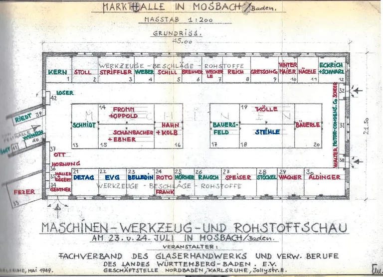 Zurück zum Verbandstag in Mosbach: Nach dem Empfang der Gäste im Bahnhofshotel folgen um 9 Uhr die Sitzung des Verbandsvorstands, um 14.30 Uhr die Generalversammlung und am Abend ein Festbankett – so weit, so gewöhnlich. Besonders herauszuheben ist allerdings der Programmpunkt, der am 24. Juli um 14.30 Uhr auf die Fachvorträge am Vormittag folgt: Besuch der "Maschinen-, Werkzeug- und Rohstoffschau" in der Markthalle der Stadt Mosbach heißt es da.
