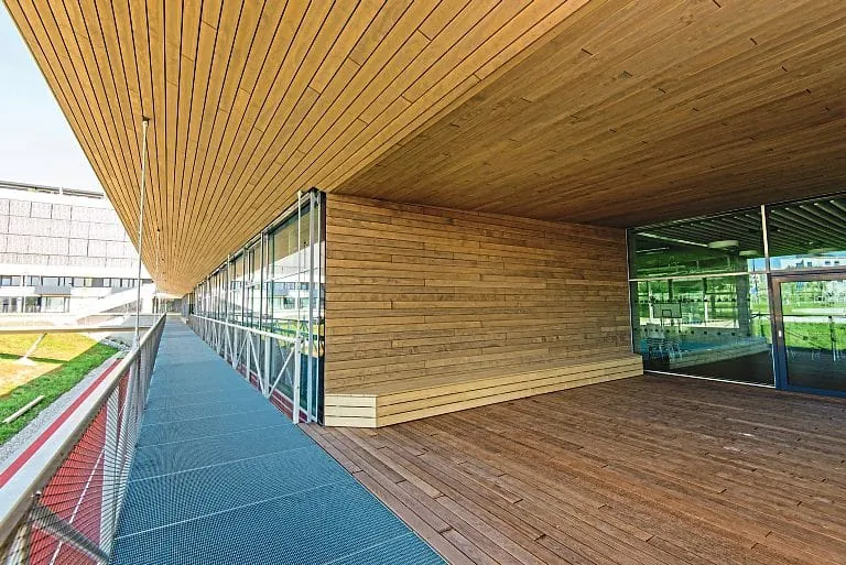 Das verantwortliche Planungsbüro fasch&fuchs.architekten in Wien legte Wert darauf, dass das 13.800 Quadratmeter große Gebäude einer nachhaltigen Architektur gerecht wird und ein innovatives Raumkonzept aufweist – was mit der Gestaltung der Außenfassade des Campus gelungen ist. Zirka 100 Kubikmeter Accoya-Schnittholz kamen zum Einsatz, um die Fläche der Außenfassade von 2.800 Quadratmeter zu verkleiden. Darüber hinaus bestehen die Dreischicht-Platten der Außentüren sowie Sitzbänke im Innenbereich des Gebäudes aus Accoya.