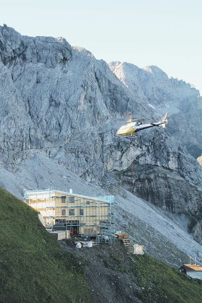 Ein Helikopter flog die Fensterpakete aus dem Tal zur Hütte auf 2.084 Meter Höhe. - © Strobel