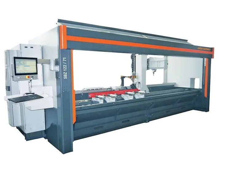 Das Fünf-Achs-Zentrum SBZ 151 ist auf die rationelle Bearbeitung von Aluminium- und Stahlprofilen ausgerichtet. Alle Arbeitsgänge wie Fräsen, Bohren, Gewindeschneiden und -fräsen, Klinken sowie Sägen laufen am ruhenden Profilstab ab – das schont die Profiloberflächen. Mit dem optional erhältlichen Winkelkopf lassen sich Profile von unten und somit zeitsparend von allen sechs Seiten in einer Aufspannung bearbeiten. Das mitfahrende Magazin verkürzt die Zeiten für den Werkzeugwechsel. Zwei Arbeitszonen erlauben die Nutzung der Maschine im Pendelbetrieb.