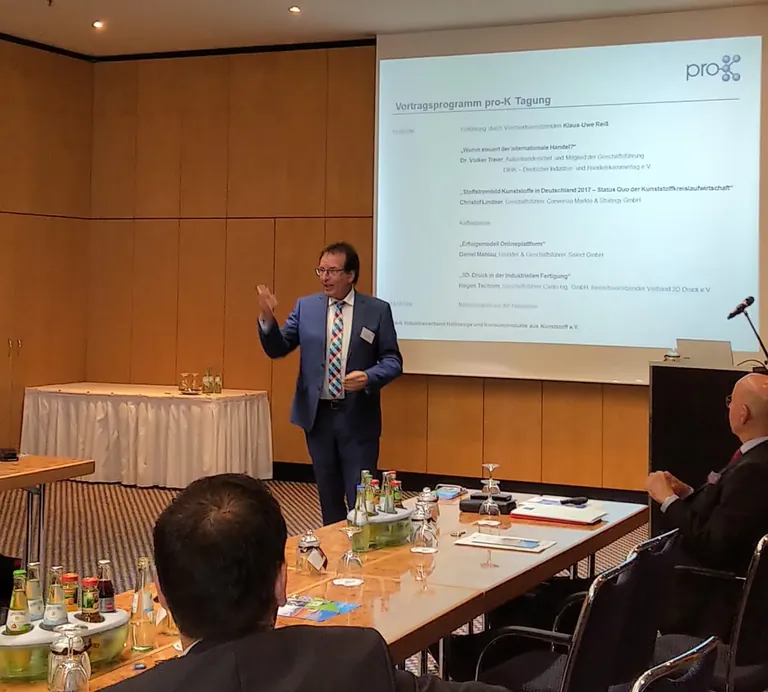 Im Anschluss an die Mitgliederversammlung standen vier Vorträge zu Trendthemen aus Wirtschaft, Technik und Innovationen auf dem Programm. Dr. Volker Treier, stellvertretender Hauptgeschäftsführer des Deutschen Industrie- und Handelskammertages (DIHK), referierte über die aktuellen Herausforderungen und Chancen des internationalen Handels, gefolgt von Christoph Lindner, Geschäftsführer Conversio Market & Strategy GmbH, der über den Status Quo zur Kunststoffkreislaufwirtschaft berichtete. Im Zuge der fortschreitenden Digitalisierung rundeten Daniel Mahlau, Geschäftsführer der Salect GmbH, und Hagen Tschorn, Geschäftsführer der Canto Ing. GmbH, die Vorträge mit Einblicken in Onlineplattformen und den 3D-Druck für die industrielle Fertigung ab. Klaus-Uwe Reiß, Vorstandsvorsitzender des pro-K Industrieverbands, zeigte sich zufrieden der Jahrestagung. „Der Einsatz unserer Gremien sowie der aktiven Unternehmen bündelt sich in einer Arbeit, die allen Mitgliedern zugutekommt.“ 2018 seien viele Branchenthemen vorangebracht sowie interessante Workshops und Veranstaltungen durchgeführt worden.