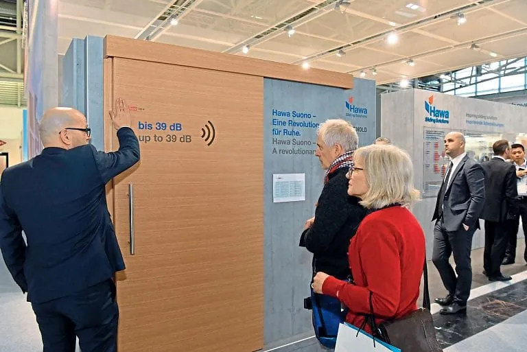 Neben den Neuheiten aus der Welt des komfortablen Schiebens lockte auch das Messekonzept von Hawa Sliding Solutions die Fachbesucher an den Messestand. „Ein guter Start ins neue Jahr“, sagt Ezequiel Di Claudio, Bereichsleiter Verkauf und Kundenservice. Der neue Beschlag Hawa Suono 100 mit 3D-Bewegung ermöglicht Schiebetürsysteme mit Schallschutz bis 39 Dezibel. Hawa Suono feierte auf der Bau im Doppelpack Premiere: als bereits lieferbares Präsentationsmodell und als Prototyp mit der Synchronbewegung von zwei Schiebetüren. Das Schiebebeschlagsystem ist für Holz-Innentüren bis 100 Kilogramm mit einer Türdicke von mindestens 51 Millimeter konzipiert. Es vereint die Vorteile von Schiebelösungen wie geringen Platzbedarf, ansprechende Optik und Barrierefreiheit mit effektivem Schallschutz und erschließt Einsatzgebiete im privaten und im gewerblichen Umfeld.