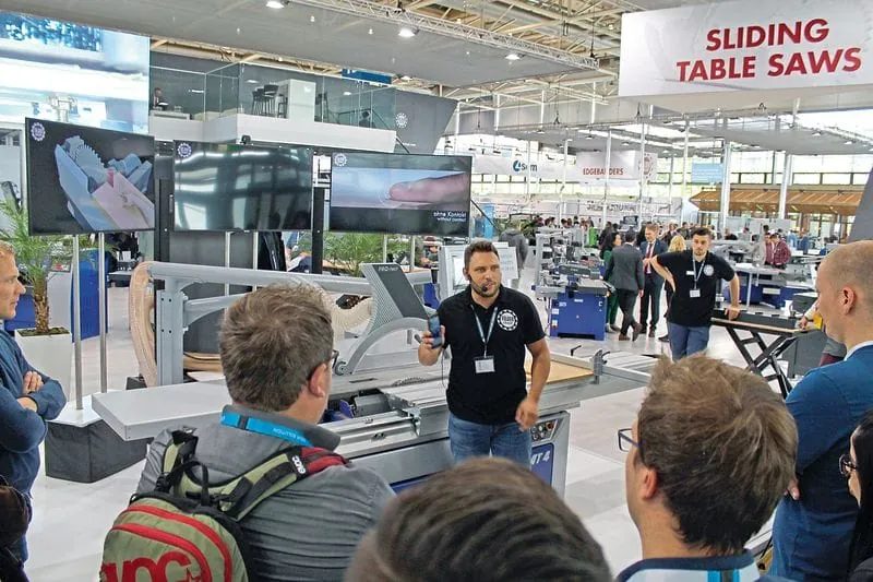 Beim Gang über die Messe und beim Besuch vieler Stände fühlte man sich zeitweise in einen Bienenstock versetzt – Schlangestehen, um einen Mitarbeiter persönlich zu sprechen, war die Regel, nicht die Ausnahme. So auch auf dem Homag-Stand in Halle 14: Um seine digitalen Konzepte erlebbar zu machen, zeigte das Unternehmen vernetzt arbeitende Maschinen, Zellen, Systeme und Software für die Holzbearbeitung, mit denen Betriebe den Schritt in die digitale Zukunft gehen sollen. Live im Einsatz waren hier beispielsweise integrierte Zellenkonzepte in verschiedenen Leistungsklassen für das Holzhandwerk bis hin zur Möbelindustrie. Jedes Konzept bestand dabei aus verschiedenen Bausteinen, damit jeder Betrieb die für ihn passende Lösung für sich adaptieren könne, heißt es aus dem Unternehmen.