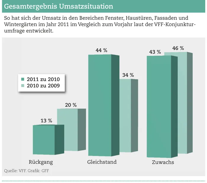 43 Prozent Zuwachs im Vergleich zum Vorjahr erzielte die Branche laut der VFF-Konjunkturumfrage 2011 mit Fenstern, Haustüren, Fassaden und Wintergärten. Im Vergleich 2010 zu 2009 waren es, wie diese Grafik zeigt, allerdings noch 46 Prozent.
